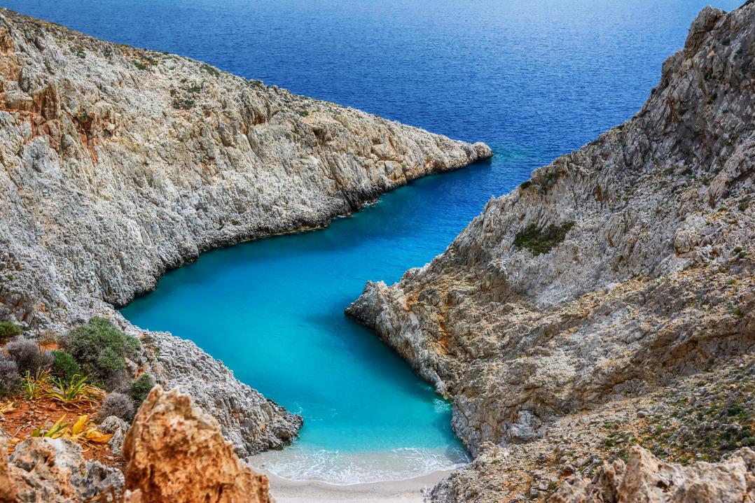 Top beaches in Chania come in all sizes. Case in point: Seitan Limania. This small, rocky fjord-like cove is small by comparison, but its intense charm and somewhat sketchy origin name (the place is called Devil’s port) have made it a favorite amongst locals and visitors. Getting to it means committing to a 20-minute downhill descent, but as you step onto the plateau and look at the iridescent fluorescent blue waters you’ll be hooked. Note that currents are strong here, so if you have kids with you, make sure they’re well looked after. This is a small beach, with small pebbly sand and no amenities, save for a canteen at the top before reaching down, so come prepared.